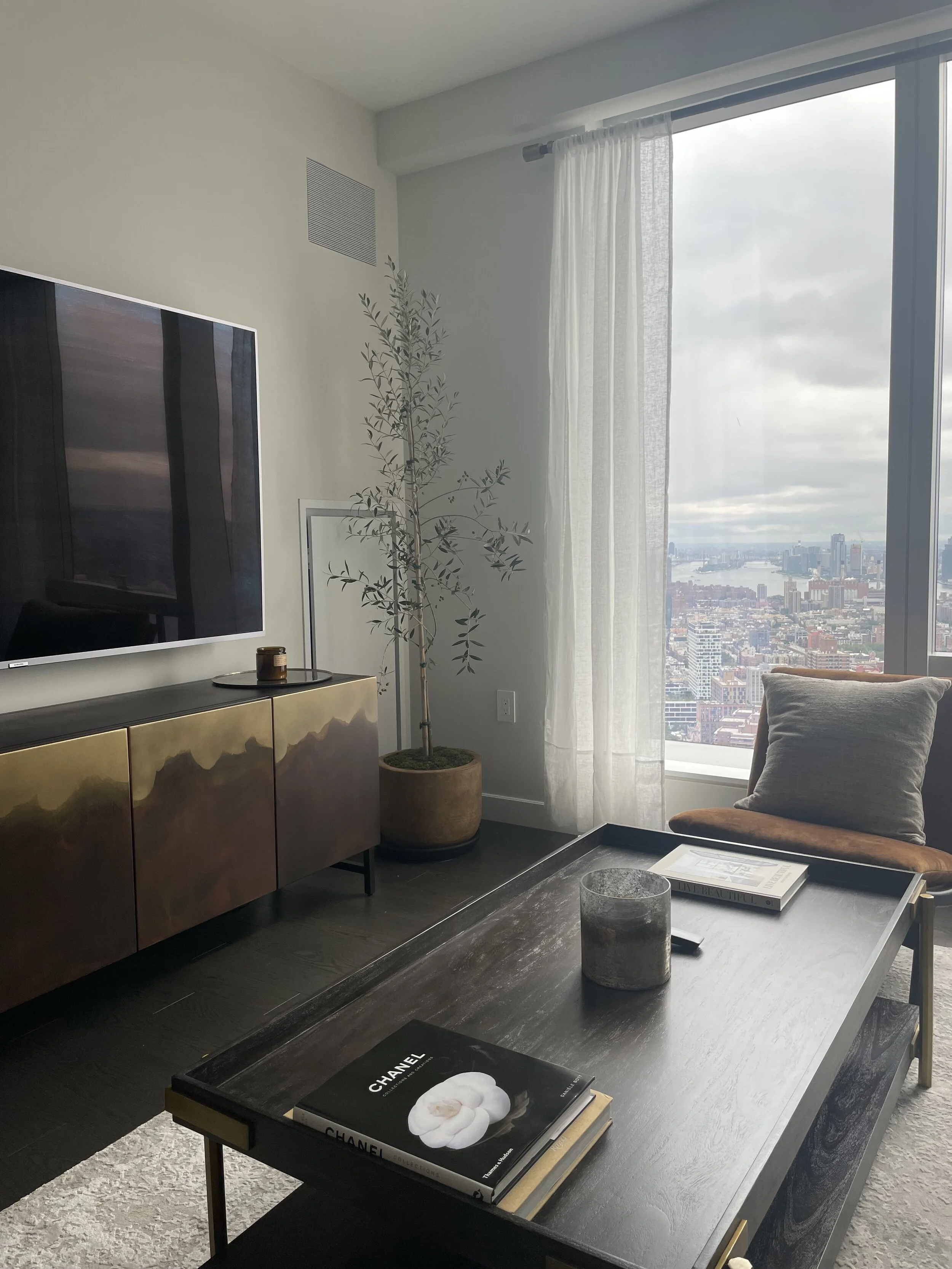 This bachelor’s condo strikes the perfect balance of masculinity and elegance. A custom acid washed credenza sits opposite a solid walnut coffee table, large neutral sofa and velvet sling accent chair.